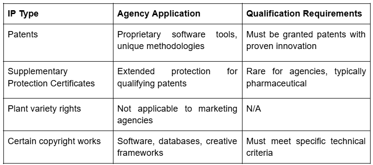 The key insight for agencies is that software development and certain systematic methodologies can qualify if they're properly protected and documented. Many agencies develop proprietary tools for campaign management, client reporting, or creative workflow optimisation without realising these could qualify for Patents Box treatment.