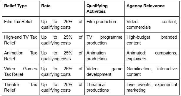 Beyond Patents Box, several relief schemes specifically target creative industries, offering significant opportunities for agencies operating in content creation, digital marketing, and creative services.