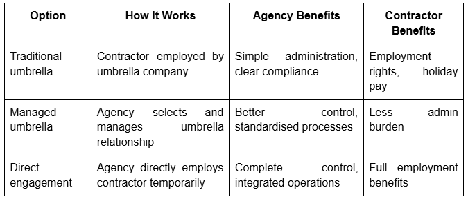When contractor relationships fall within IR35, agencies need compliant alternatives that work commercially for both parties. Understanding these options helps maintain access to necessary skills while ensuring tax compliance.